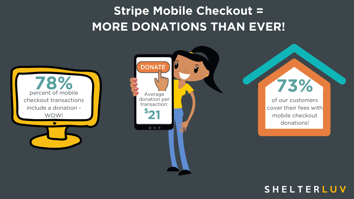 The bummer news is that due to concerns about processing fees, a lot of our smaller customers have missed out on this feature and the donation dollars that come with it. We wanted to make sure that ALL of our customers had a chance to raise some serious donation dollars without forcing their adoption staff to “make an ask.” We did some research and realized that most nonprofits are now giving their donors an opportunity to help them with overhead costs by covering the processing fees associated with their donation. In fact, depending on the donation platform, up to 65% of donors will choose to cover their processing fees, adding to their overall donation to your organization. That’s why we released an update to our Stripe-powered mobile checkout that offers donors the chance to cover the processing fees from their transaction in addition to making a donation!