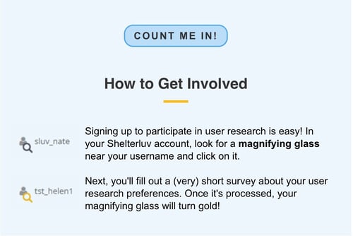 ![]() At Shelterluv, we’re committed to creating a product that makes our customers’ lives easier. We have always done this by talking to you—our users—who have helped shape Shelterluv into the leading standard in shelter software. What’s next for Shelterluv is the biggest investment we have ever made in our product. Your input is more important than ever as we reimagine the Shelterluv experience. All Shelterluv customers are invited to join our new user research community. You will receive invitations to participate in discovery calls, in-product surveys, usability testing, and beta testing. Most importantly, you will be helping us make the best possible product for the thousands of shelters and rescues using Shelterluv everyday. Learn More About User Research ![]() ![]() |